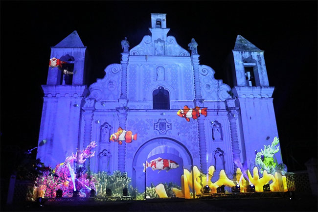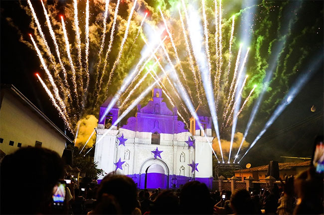 Gracias (Lempira), 17 de julio. La riqueza natural, la diversidad cultural y pasajes de la historia de Honduras iluminaron la fachada de la iglesia La Merced de Gracias (Lempira) con la proyección de un video mapping edición Bicentenario.