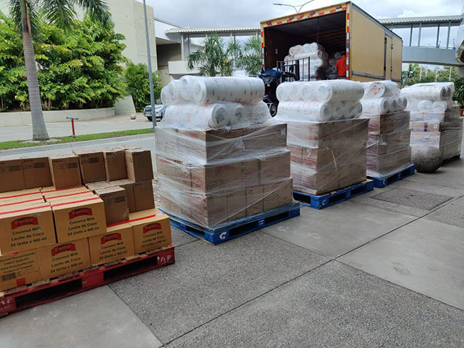 El segundo a la Cámara de Comercio e Industrias de Cortés (CCIC), consistente en 4,497 kilos de productos básicos y kit de higiene para atender a más de 300 albergados en Expocentro y más de 5,000 afectados en el Valle de Sula.
