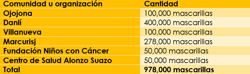 En el caso de Honduras, la donación para World Vision Honduras asciende a 978,000 mascarillas que serán distribuidas en comunidades en desarrollo y organizaciones civiles que trabajan a favor de poblaciones vulnerables.